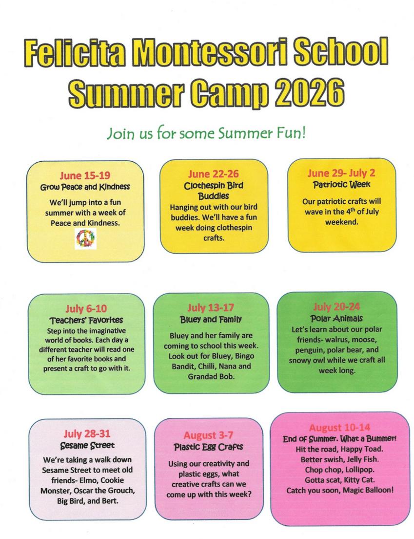 Our Summer Camp is for currently enrolled children and those registered for the 2026-27 School Year. Activities are adjusted to keep kids of all ages engaged. Felicita Montessori School is located just off the I-15 making it easy for parents to drop kids off.
